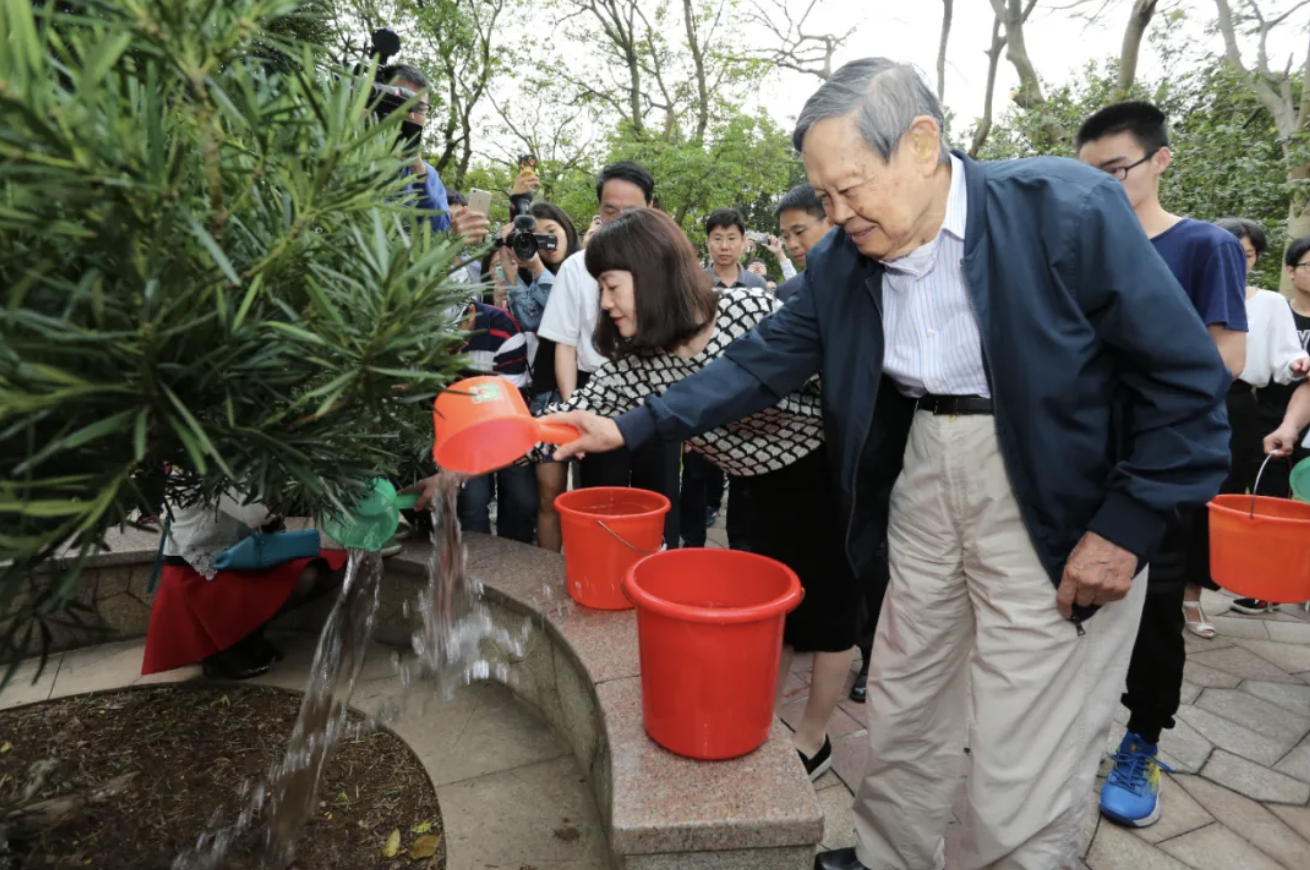 杨振宁先生为亲手在莞工种下的罗汉青松浇水